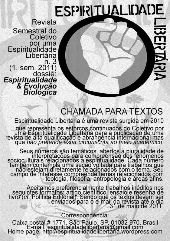On the third edition of Espiritualidade Libertária, for the dossier Spirituality and Biological Evolution, we invite you to submit papers that seek dialogue and interaction between the scientific understanding of reality and spirituality, as well as a critical analysis of points of conflict in which the religious and scientific points of view seem to collide. In particular the development of the “Creationist/Inteligent-Design” movement, which first developed in the U.S., but has been spreading particularly amongst evangelicals. Given the space that these groups have gotten lately – the newspaper Folha de São Paulo published in April 2nd, 2010 a poll that revealed that 25% of people interviewed believe that human being was created from a single supernatural act of creation about 10.000 years ago (see: http://www1.folha.uol.com.br/folha/ciencia/ult306u715507.shtml) –, it would be interesting to approach critically they arguments and goals, as well as the social and historical context in which these ideas have first developed and spreaded.