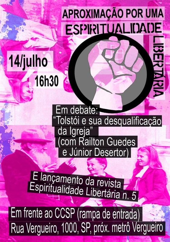 No próximo sábado (14) vai rolar nossa Aproximação por uma Espiritualidade Libertária. Dessa vez a discussão será sobre o pensamento de Tolstói, por conta da revista Espiritualidade Libertária n. 5 que estamos lançando e tem dossiê sobre Tolstói. Contaremos com a presença dos amigos Railton Guedes e Júnior Desertor para começar a discussão.