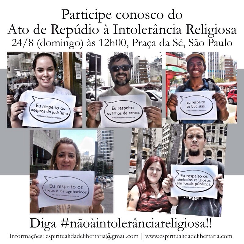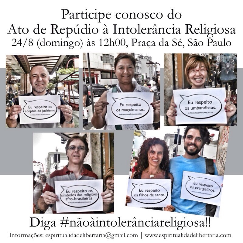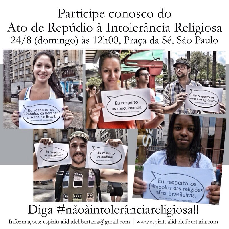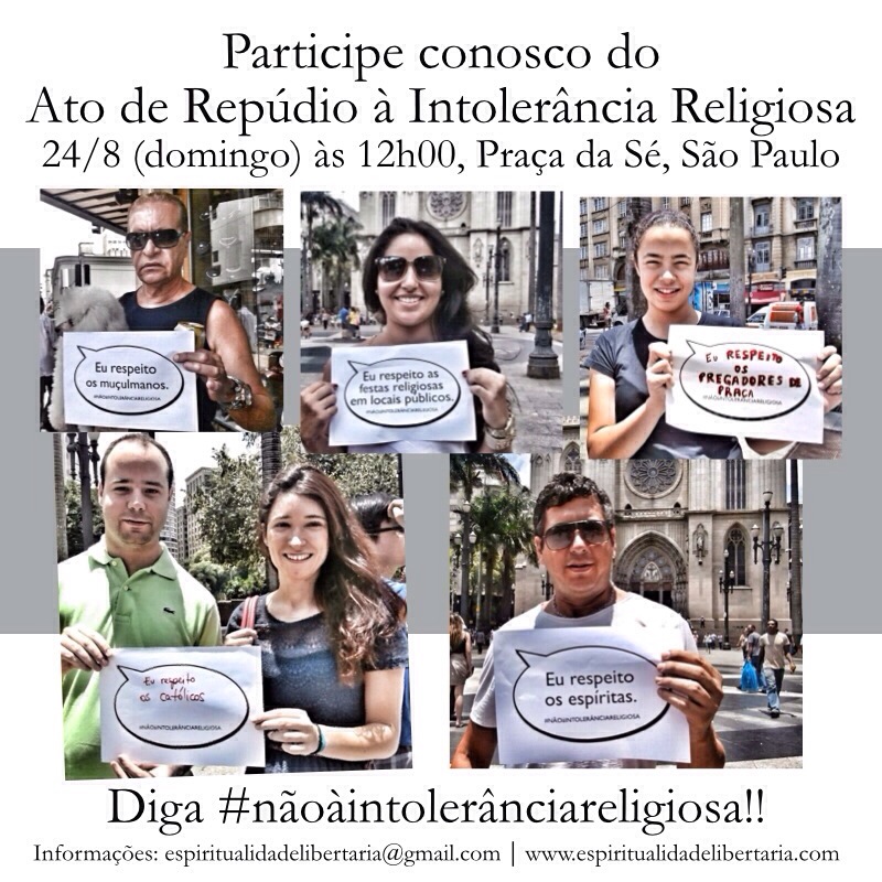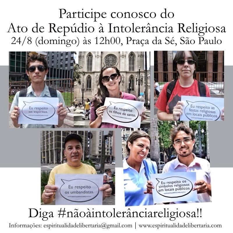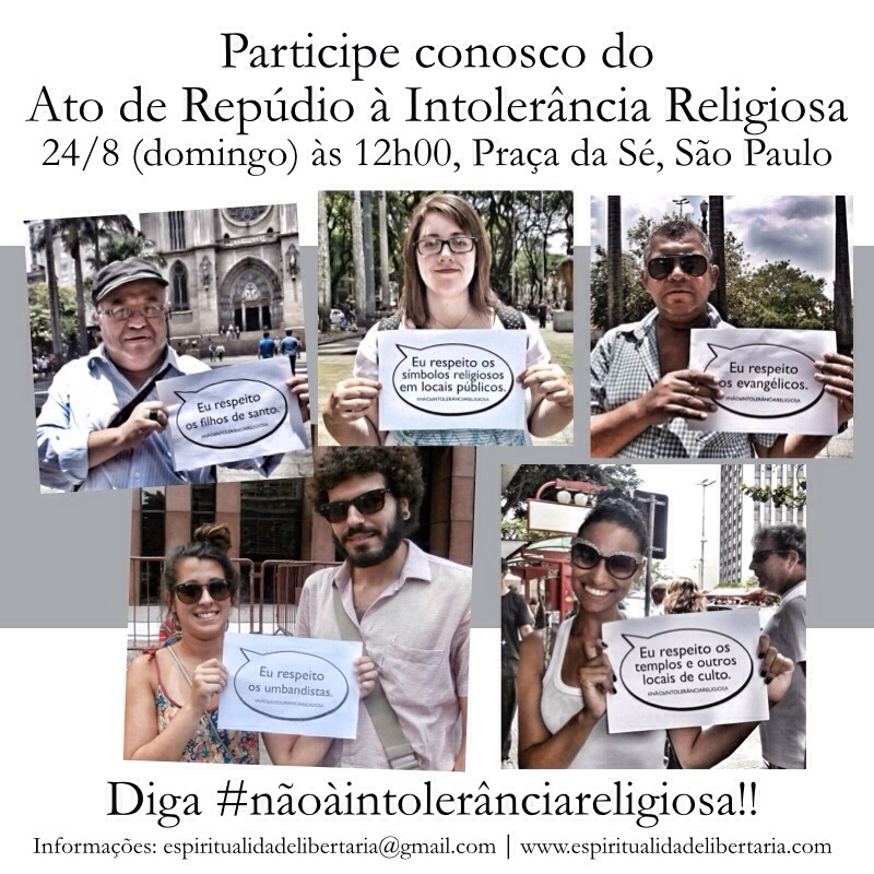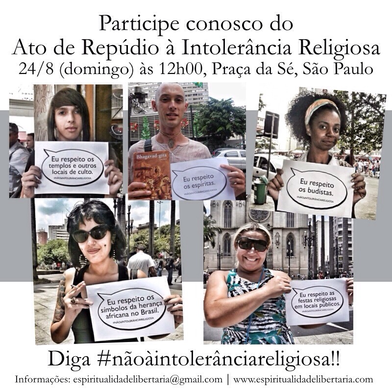 No dia 24 de agosto (domingo) às 12h00, na Praça da Sé, aqui em São Paulo, ocorrerá o Ato de Repúdio à Intolerância Religiosa. Este ato é organizado e apoiado por diversos adeptos das religiões afro-brasileiras, pois infelizmente é o povo-de-santo que mais sofre com a intolerância religiosa no Brasil.