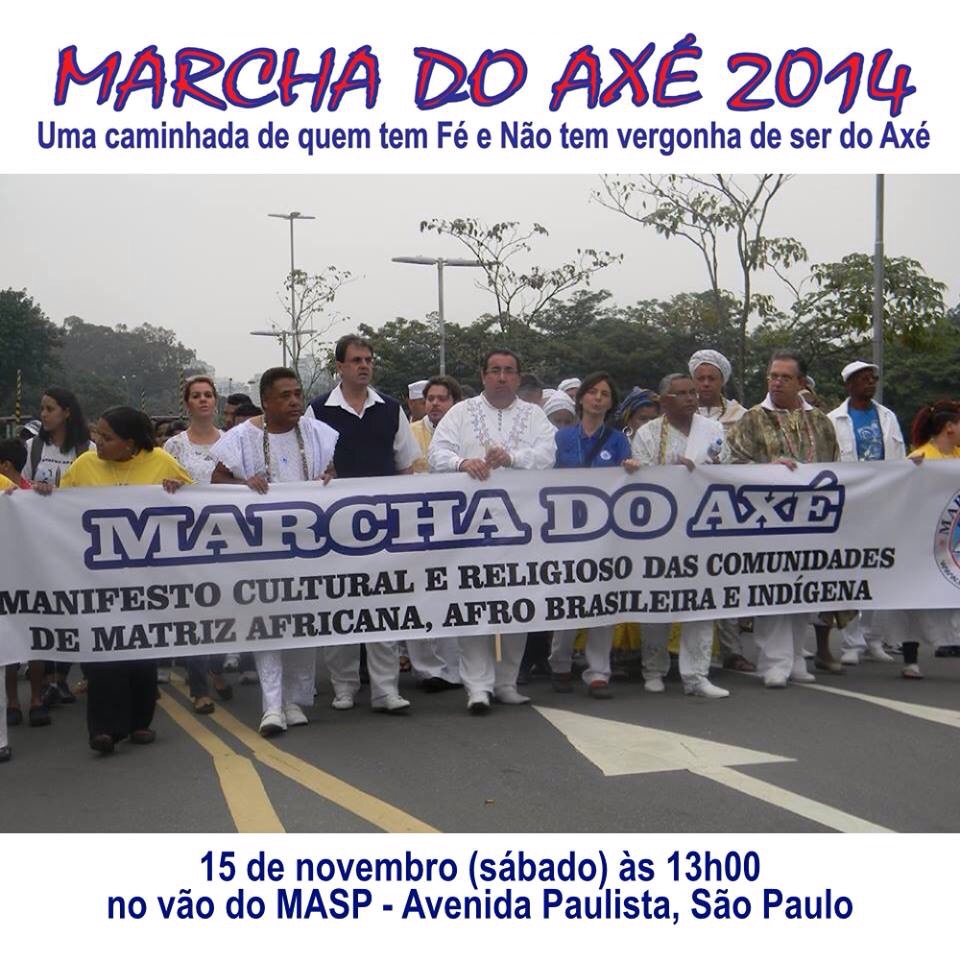 No dia 15 de novembro (sábado) a partir das 13h00, ocorrerá a Marcha do Axé, que partirá do vão do MASP, na Av. Paulista, São Paulo. É uma ótima oportunidade para apoiar os irmãos e as irmãs do axé. Compareçam e digam #nãoàintolerânciareligiosa!!