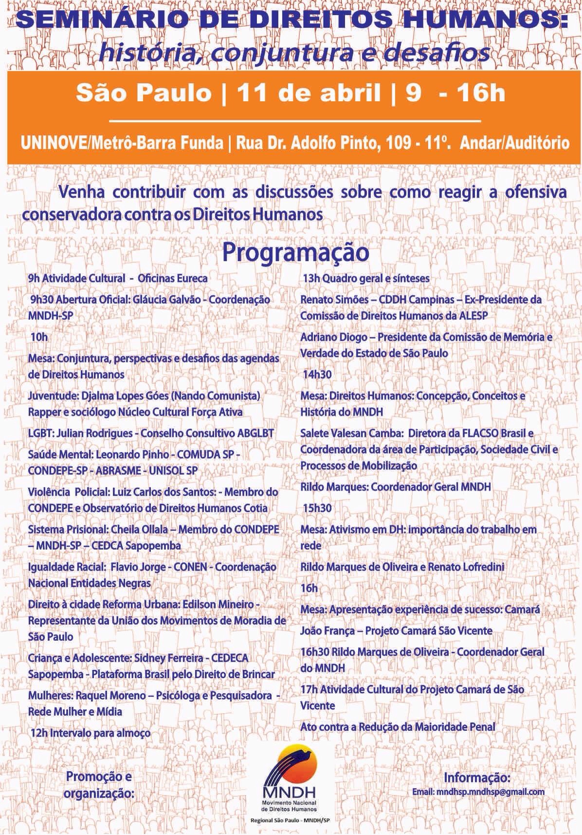 No próximo sábado (11), ocorrerá o “Seminário de Direitos Humanos: história, conjuntura e desafios”, aqui na cidade de São Paulo.